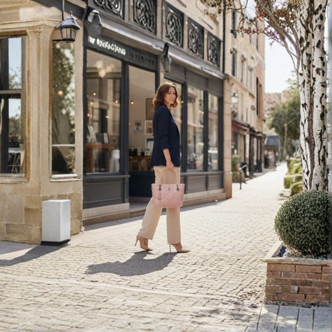 A modern and stylish tote handbag with a soft pastel finish and geometric design. Ideal for daily use, office wear, or casual outings.