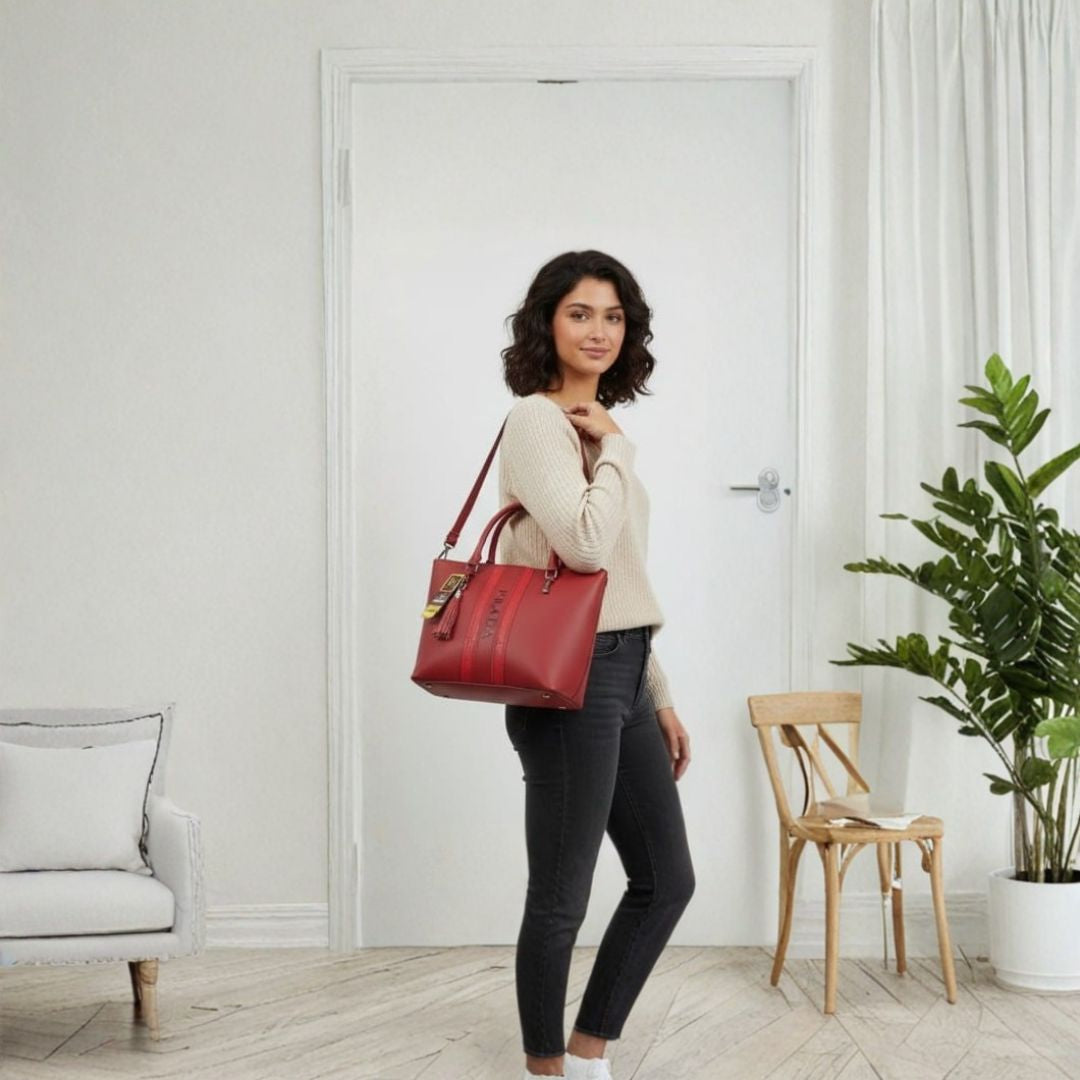 Stylish red structured tote with top handles, vertical stripe detail, and a spacious interior for everyday use.