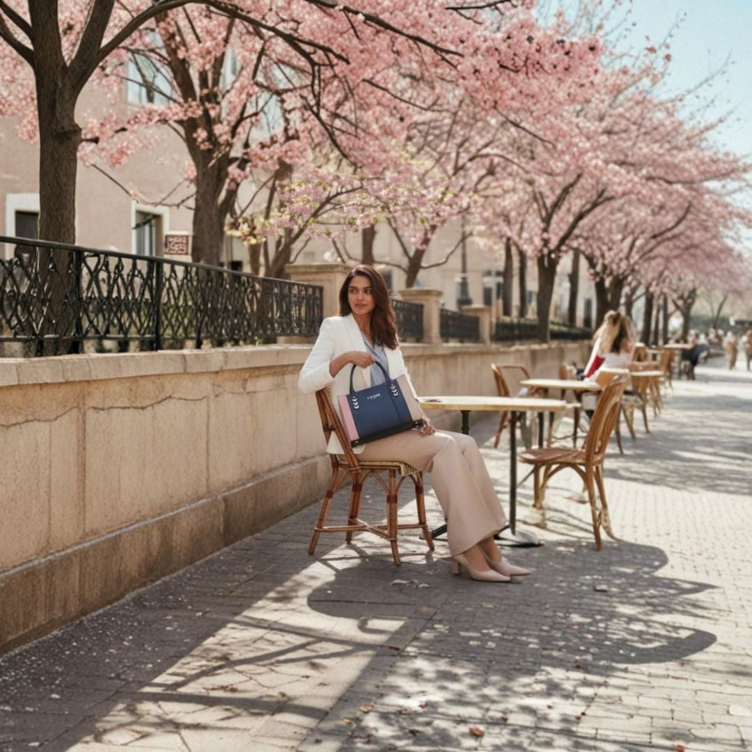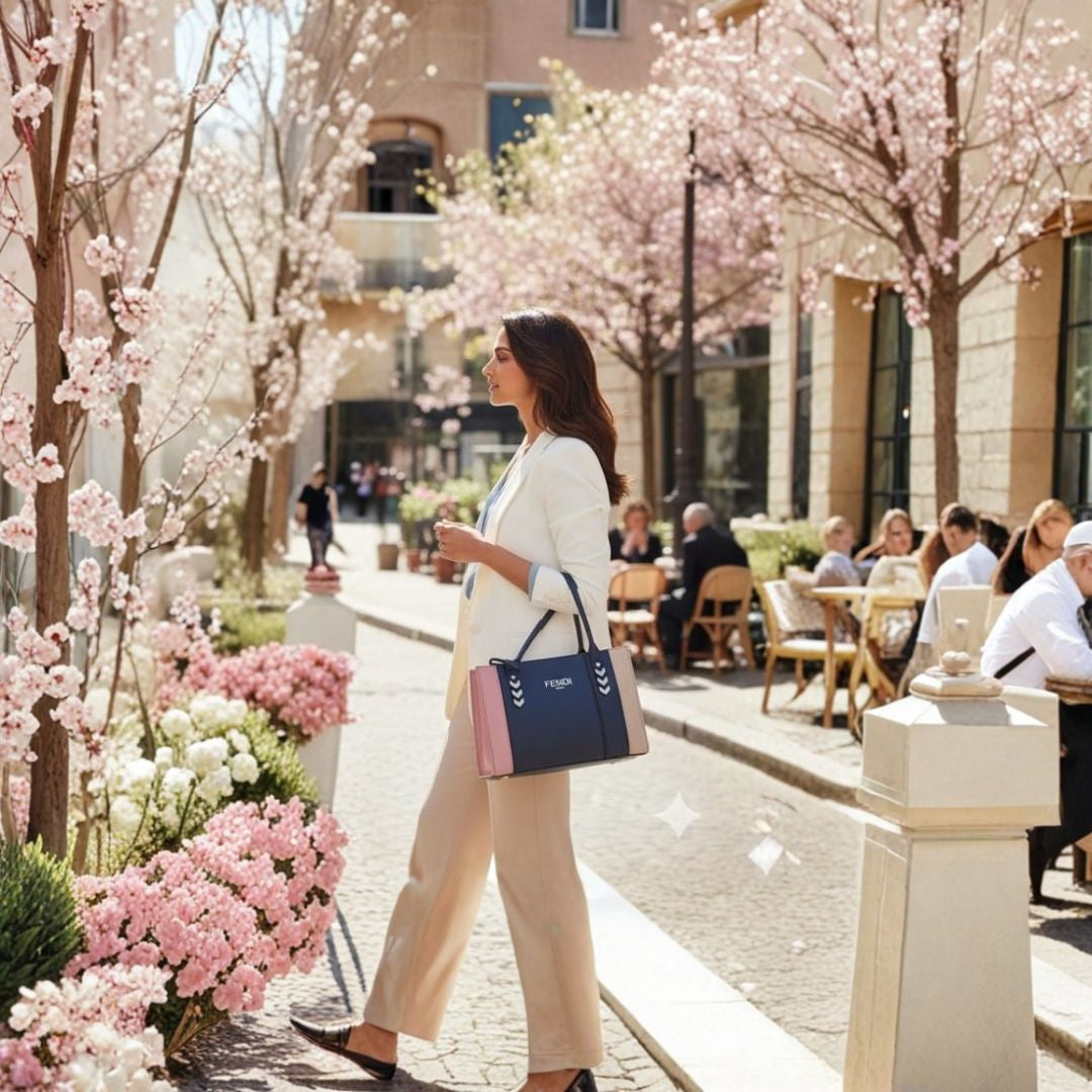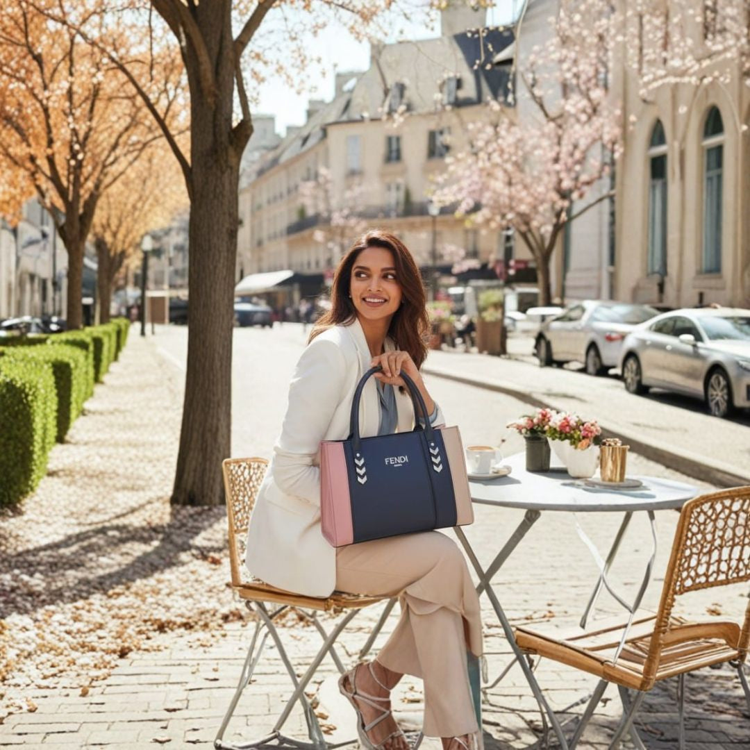 Black Fendi Roma leather tote with pink & beige side panels, silver “FENDI ROMA” logo, and chevron hardware.