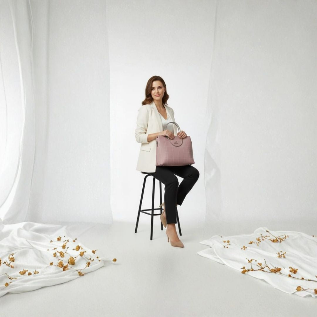Pink Grid‑stitched Leather Handbag with Metal Handle