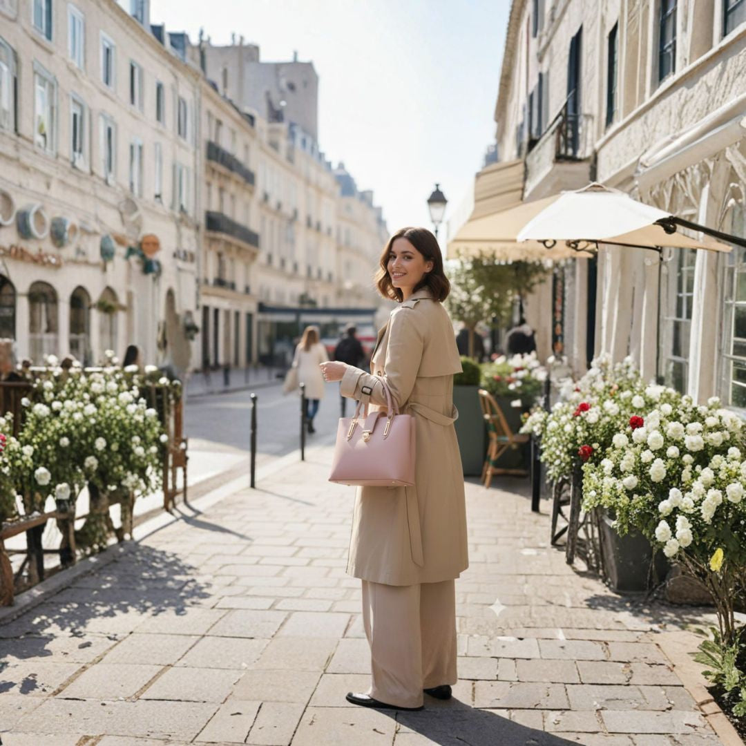 A structured, pink leather mini tote with rounded handles, gold‑tone vertical side accents, and a front strap closure featuring a circular gold logo emblem.